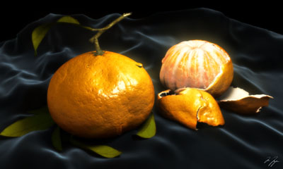 The image itself was never intended to be photo realistic but more of a glamorous idealistic portrait shot. The satsuma itself has a cellular type of bump to get the overall bump and then a few bitmaps to bump the 'pores' and colorize them. Below is a little closeup of the skin at 1:1 resolution: